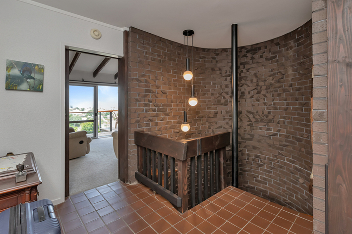 A spiral stairwell, we are talking the seventies, accesses the basement below.